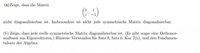 Eine matrix a ist diagonalisierbar, wenn es eine invertierbare matrix v gibt, sodass v^1*a*v eine matrix ist, die nur aufd er diagonalen sind.